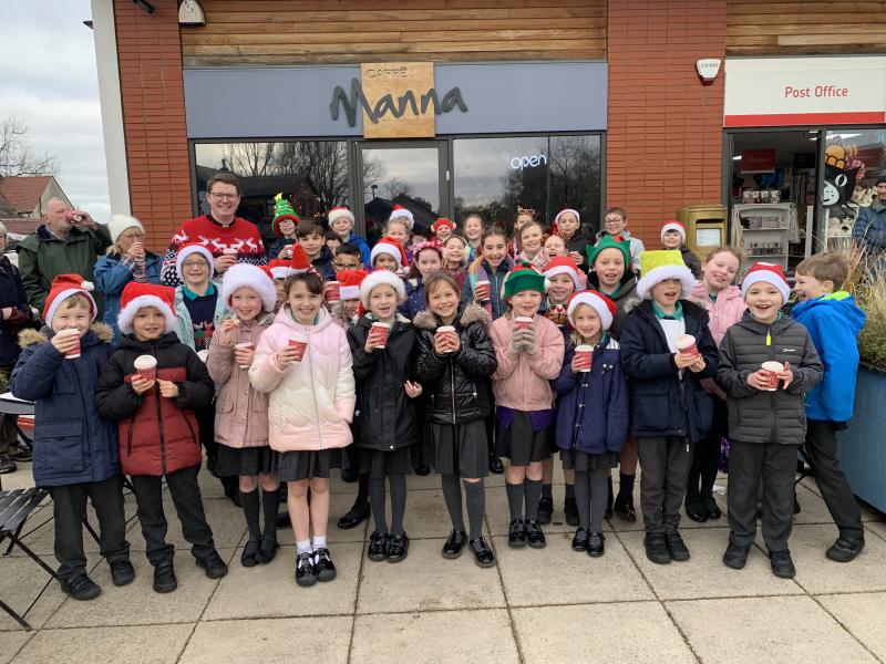 The School Choir, with Fr Jordan leading the village in Christmas Carols outside Cafe Manna, December 2024.